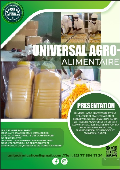 Universal Agro-Alimentaire est une entreprise sénégalaise créée en 2020, spécialisée dans la transformation, la conservation et la commercialisation de produits agro-forestiers. Nous couvrons toute la chaîne de valeur, de la production à la vente, en passant par la transformation et la conservation.